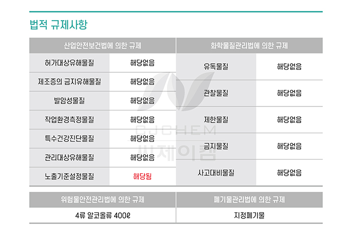 에탄올은 ACGIH(미국산업위생전문가협회)에서 A3(동물 발암성이 확인된 물질)로 지정된 성분으로, 이에 대한 대체가 필요한 실정입니다. BCS-SS는 이러한 유해물질을 포함하지 않은 친환경 세척제로, 에탄올뿐만 아니라 특수건강진단물질 및 관리대상물질인 IPA(이소프로필알코올)까지 대체할 수 있습니다.