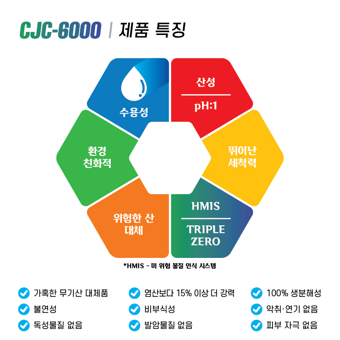 CJC-6000은 강력한 세정력, 뛰어난 안전성, 그리고 친환경성을 동시에 갖춘 배관·설비 관리용 세척제입니다. 설비 효율 저하와 유지비 증가로 고민하고 계신다면, CJC-6000으로 안전하고 경제적인 세정을 경험해 보시기 바랍니다.